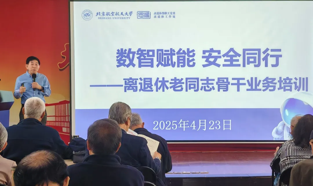 4月23日下午,北航思源楼二层多功能厅气氛热烈。网络安全与信息化学院退休教授刘连忠应邀走进思源讲堂,为80余名离退休党支部宣传委员以及关工委老同志骨干带来“数智赋能 安全同行”专题讲座。离退休党委副书记、离退休工作处副处长郭永秀主持活动。
