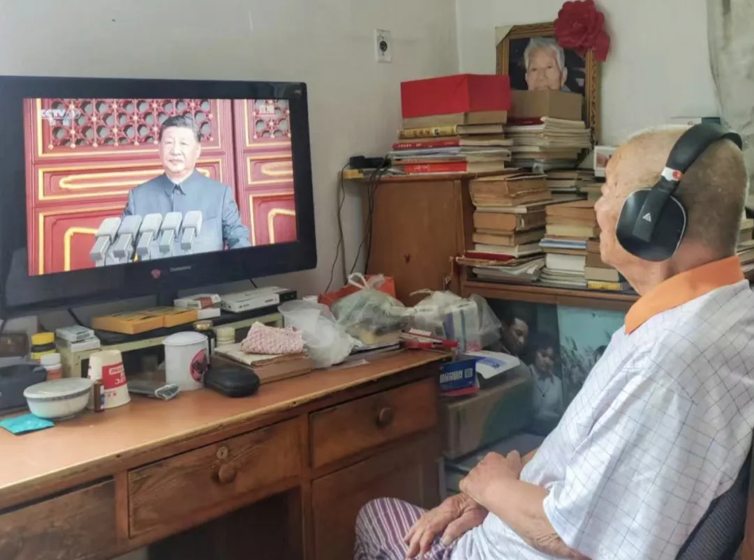 北航离休干部、抗战老兵于高光,今年已经102岁,耳聋的他让家人早早调试好耳机,坐在电视机前认真看完全程。他动情地说:习近平总书记的讲话让我心潮澎湃,作为一名从烽火岁月走过来的抗战老兵,我将永远坚定不移地听党话、跟党走,用永不褪色的忠诚信仰,守住荣光、续写担当。