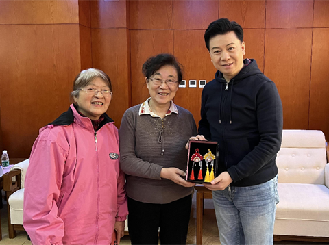 4月12日,“梅韵流芳”胡文阁梅派艺术讲座暨校园传承版梅派艺术经典汇报演出在我校晨兴音乐厅圆满举行。晚上正式演出前,离退休党委副书记曲珊陪同我校老年社团手工协会代表赵燕星、朱明玉老师向胡文阁先生赠送手工绳编凤冠挂饰。
