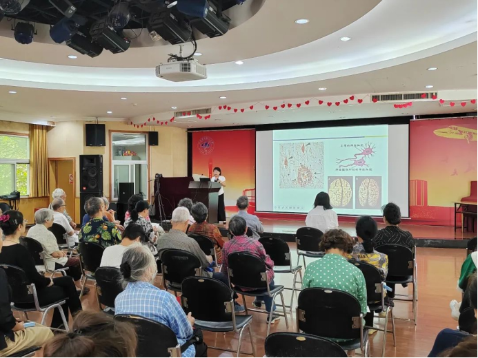 讲座中,赵副院长通过丰富的视频和图片资料为大家形象地讲解阿尔兹海默症的具体表现、如何预防和诊断阿尔兹海默症及其相应治疗办法,并耐心解答老同志们提出的各类问题。