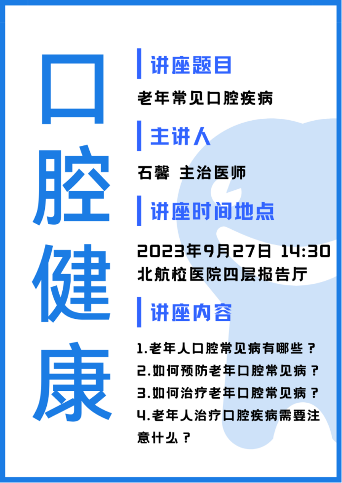 据了解,校医院和离退休工作处将根据老同志实际需求继续推出老年常见口腔疾病讲座,时间为9月27日(周三) 14:30,地点在校医院四层报告厅。