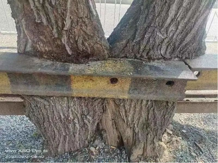 不远处,一根锈迹斑斑的铁轨,深深的嵌在树干里,它们融为一体的模样,也在无声诉说着这里沧海桑田的变化。