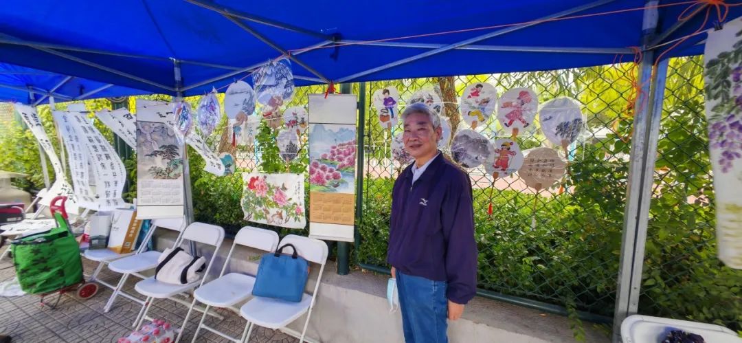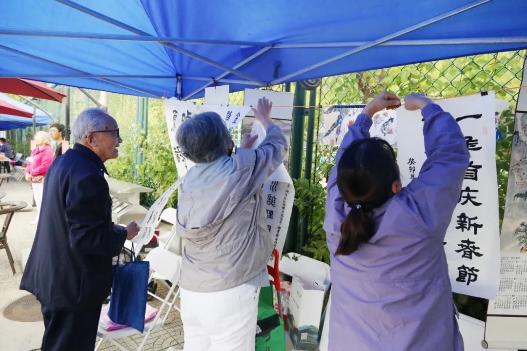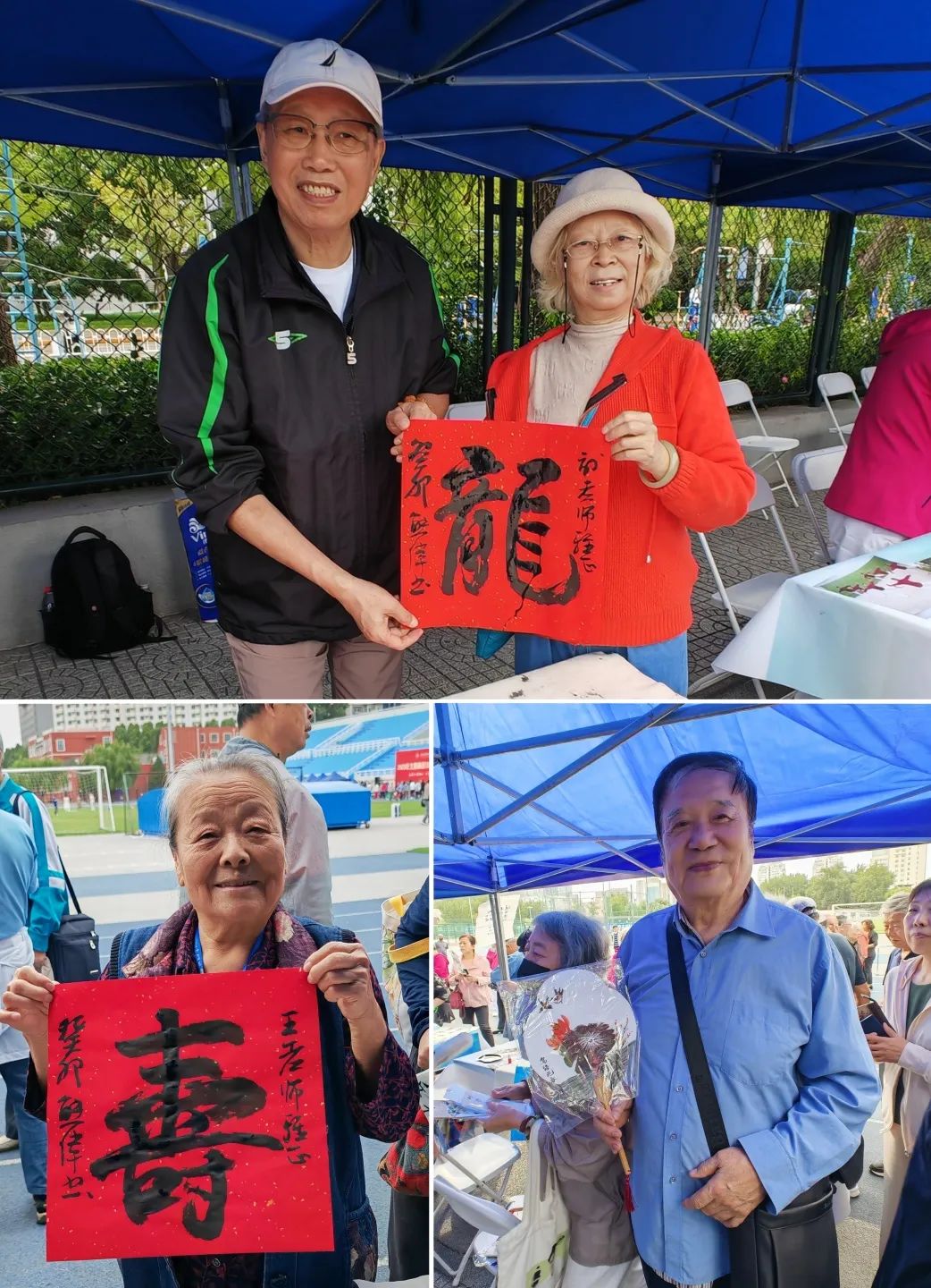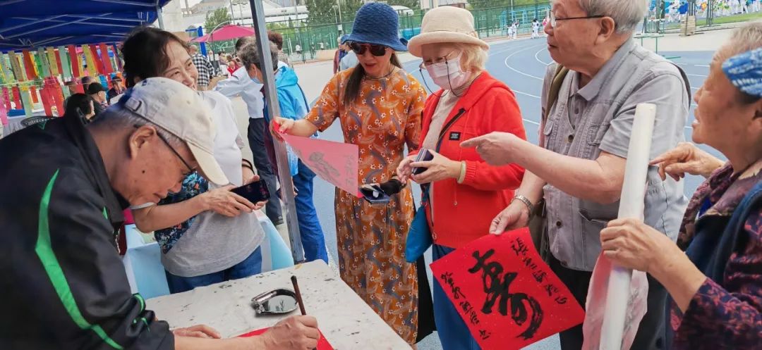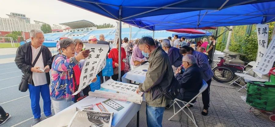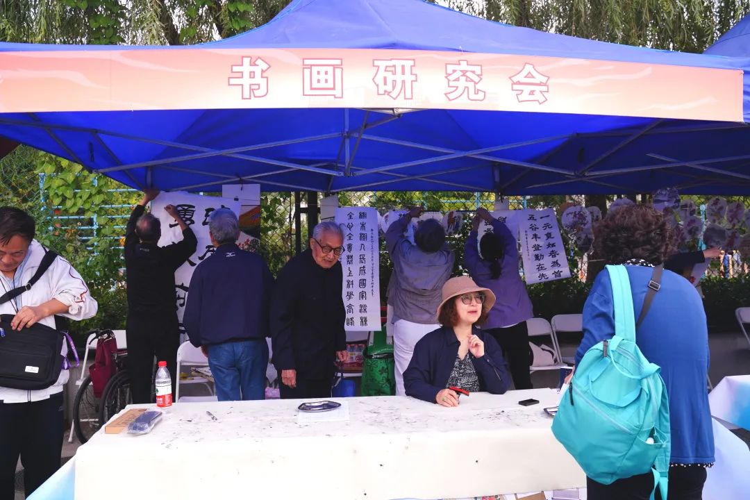 书画研究会的帐篷前门庭若市,气氛热烈。几位老师现场为老同志书写“福”、“寿”、“龙”等字,用传统方式为大家送祝福、送好运,颇受老同志欢迎。
