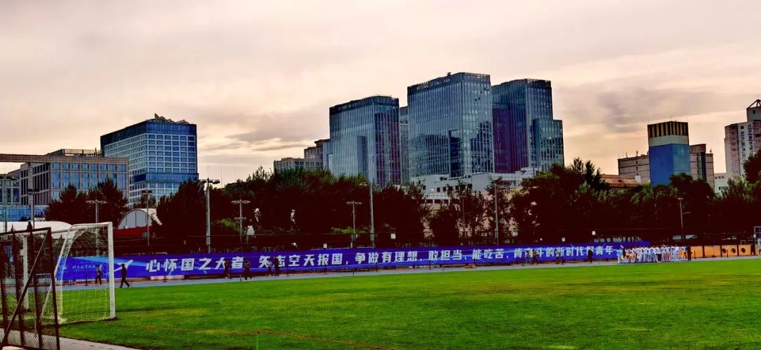 足球场东边,悬挂的“心怀国之大者,矢志空天报国,争做有理想、敢担当、能吃苦、肯奋斗的新时代好青年”蓝色条幅特别醒目。天空朦胧,绿茵绵绵,远眺学校的教学科研大楼在晨光的照耀下清晰可见。