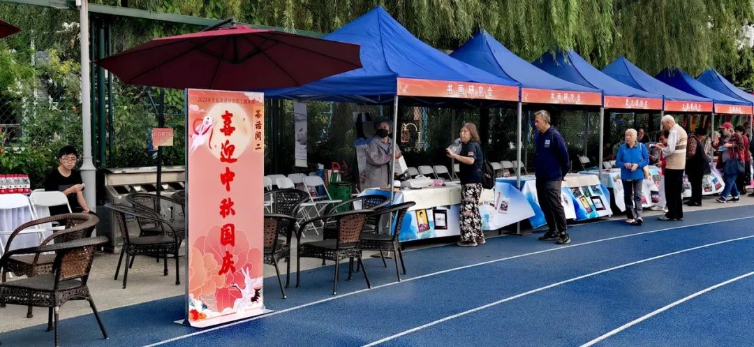 北航老年社团各协会的活动帐篷整齐排列在田经跑道的外侧,供各单位老同志与在职同志共叙情谊的茶话间也坐落在此处。
