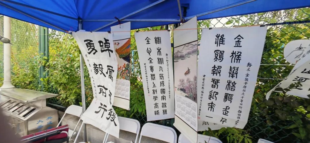 笔墨飘香,传承文化,欢声笑语处正是我们书画研究会的帐篷。在嘉年华活动开幕前,我们紧锣密鼓地悬挂各自在活动前完成的书画作品。
