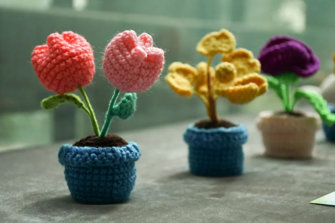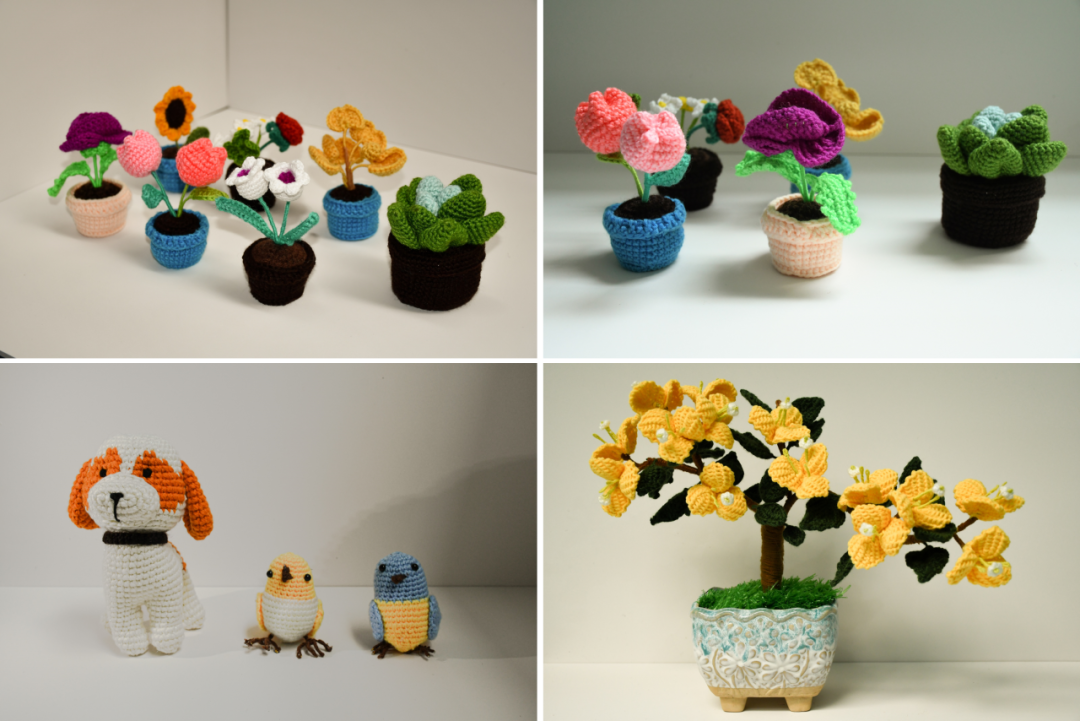 钩编、珠编、绳编,有盆栽小花,也有傲雪寒梅,有狗兔狐鸟,也有展翅雄鹰,有帽子背包,也有簪缨配饰。巧手巧思,惟妙惟肖,琳琅满目,精彩纷呈。