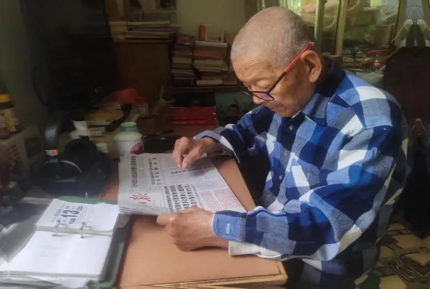 走进于老家时,他戴着老花镜正在认真阅读《人民日报》,丝毫没有察觉有客人到来。于老的女儿说,读书看报是他每天必做的事。虽已年过百岁,但于老丝毫未消减学习热情,柜子里存放着几大本报纸上剪下的“豆腐块”。