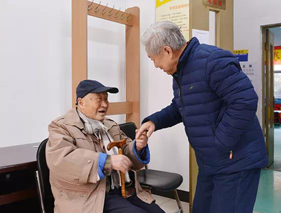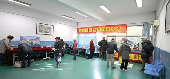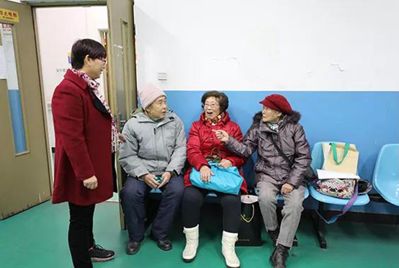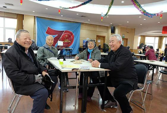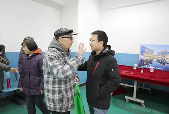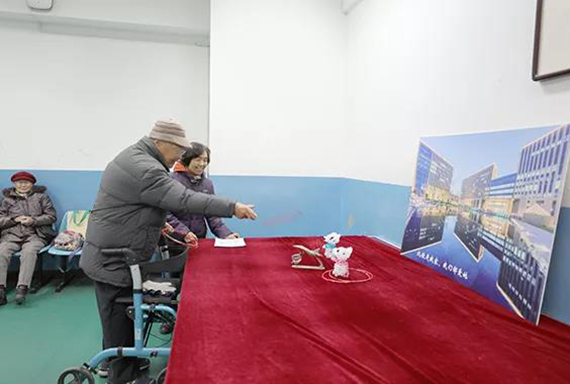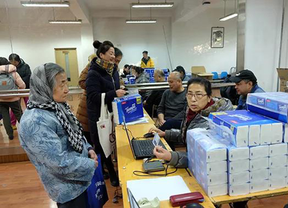 志愿者为老同服务发放游艺会礼品